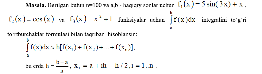 Programma bosh funksiya, integral hisoblash va ikkita matematik funksiyalar - f1(x) va f3(x) uchun aniqlangan funksiyalardan tashkil topadi, funksiyaning adresi «math.h» sarlavha faylidan olinadi. Integral hisoblash funksiyasiga ko‘rsatkich orqali integrali hisoblanadigan funksiya adresi, a va b - integral chegaralari qiymatlari uzatiladi. Oraliqni bo‘lishlar soni - n global o‘zgarmas qilib e’lon qilinadi.