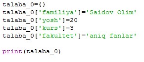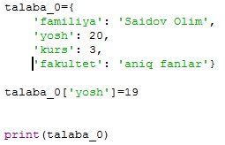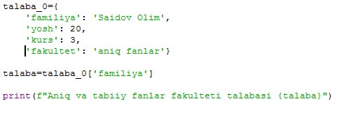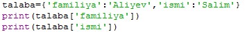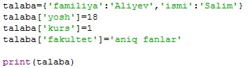 talaba={’familiya’:’Aliyev’,’ismi’:’Salim’}