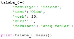 dict_items([('familiya', 'Saidov'), ('ismi', 'Olim'), ('yosh', 20), ('kurs', 3), ('fakultet', 'aniq fanlar')]) |