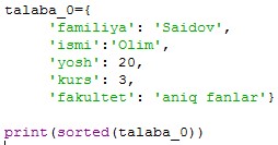 Agar lug'at elementlarini alifbo bo'yicha chiqarish talab qilinsa, funktsiyasidan foydalanamiz.