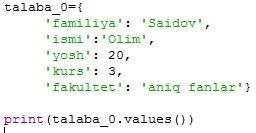 dict_values(['Saidov', 'Olim', 20, 3, 'aniq fanlar']) |