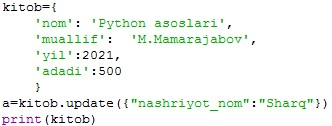 6. update() metodi belgilangan kalit-qiymat juftlari bilan lug'atni yangilaydi
