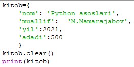 10. clear() metodi lug'atdan barcha elementlarni olib tashlaydi