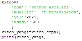 {'nom': 'Python asoslari', 'muallif': 'M.Mamarajabov', 'yil': 2021, 'adadi': 500} |