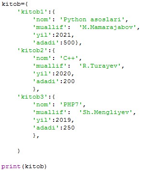 {'kitob1': { 'nom': 'Python asoslari', 'muallif': 'M.Mamarajabov', 'yil': 2021, 'adadi': 500}, 'kitob2': {'nom': 'C++', 'muallif': 'R.Turayev', 'yil': 2020, 'adadi': 200}, 'kitob3': {'nom': 'PHP7', 'muallif': 'Sh.Mengliyev', 'yil': 2019, 'adadi': 250}} |