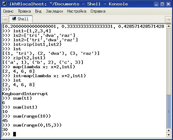 Python kompilyator rejimida ishlash qobiliyatiga ega, unda buyruqlar va operatsiyalar ular kiritilgandan so'ng darhol bajariladi. Python kompilyatori buyruq qatoriga python buyrug'ini kiritish orqali chaqiriladi. Kompilyator ishlashning namunasi (interfaol qobiq) rasm. 1.1 da keltirilgan. Ushbu rejimdan chiqish uchun < CTRL > + < D > tugmalar birikmasidan foydalaning.