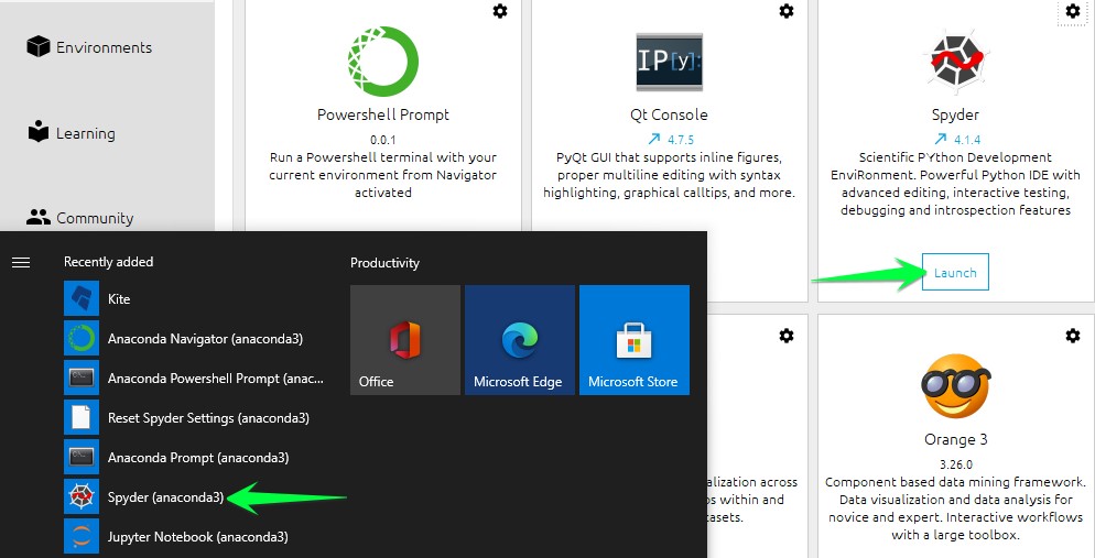 Kelajakda siz o'zingiz uchun qulay muhitni tanlab, yangi dasturlarni yangi muhitda yozishingiz mumkin. Boshlanishiga esa biz Anaconda bilan birga keladigan qulay va sodda, lekin shu bilan birga funktsiyalarga boy bo'lgan Spyder muhitini tanlaymiz.
