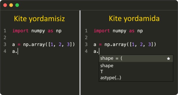 Kite —sun'iy intellekt asosida ishlovchi virtual yordamchi bo'lib, kod yozishni osonlashtiradi. Kite yordamida istalgan funktsiya yoki komanda haqida qo'shimcha ma'lumot olishingiz mumkin. Shungdek Kite sizga kodlarni to'g'ri yozishda ishora (подсказка) ham ko'rsatib turadi.