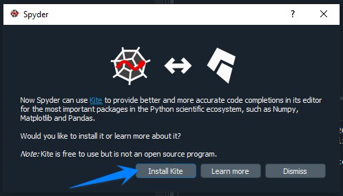 Spyder dastruni ilk marotaba ochganimizda Kite dasturlash yordamchisini (pogramming assistant) o'rnatishni taklif qilishi mumkin.