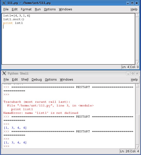 Python uchun eng oddiy IDE IDLE deb nomlanadi (1.2-rasm). Ushbu muhitda siz dastur matnlarini muharrir oynasida tahrirlashingiz va ularni ijro etish uchun ishlatishingiz mumkin. Bajarilish natijalari interfaol Python qobig'ining oynasi bo'lgan ijro oynasida aks etadi (ya'ni, bu oynada buyruqlar ham bajarilishi mumkin).