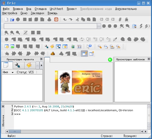 Shuningdek, IDE Eric maxsus Python uchun ishlab chiqilgan (1.3-rasm), u dasturlar va yirik dasturiy ta'minot loyihalari uchun juda ko'p sozlash va disk raskadrovka qilish qobiliyatiga ega. Biroq, ushbu rivojlanish muhiti (aniqrog'i uning tashqi ko'rinishi) sezilarli darajada soddalashtirilishi va yangi boshlanuvchilar uchun tushunarli bo'lishi mumkin (1.4-rasm).