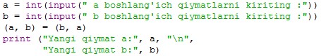 Yechish usuli (umumiy): a o'zgaruvchisining boshlang'ich qiymatini yozib olish uchun qo'shimcha c o'zgaruvchisidan vaqtincha foydalanib tayinlash, b o'zgaruvchisining qiymatini a o'zgaruvchisiga tayinlash va c o'zgaruvchisining qiymatini b o'zgaruvchisiga tayinlash foydalaning.