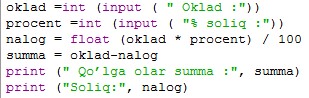 Masalani qo’yilishi: Ish haqi (o'zgaruvchi oklad, raqam sifatida ifodalangan) va daromad solig'i stavkasi (o'zgaruvchi procent, raqam sifatida ko'rsatilgan). Soliq summasi (o'zgaruvchi nalog) oklad * procent / 100 ko’rinishida aniqlanadi, qo’lga olish summasi (o'zgaruvchi summa) oklad-nalog sifatida belgilanadi..
