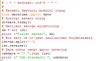 Keling, Python-dagi dasturga o'tamiz. Python-da sana va vaqt bilan ishlash funksiyalari datetime moduli tomonidan boshqariladi, date ob'ekti va uning usullari to'g'ridan-to'g'ri sana bilan ishlashda ishlatiladi.
