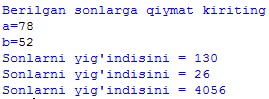 6 topshiriq. Ikkita haqiqiy a va b son berilgan bo’sin. Sonlarni ayirmasi, yig’indisi va ko’paytmasini topish dasturini tuzing.