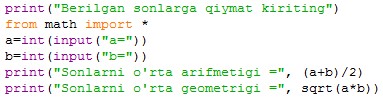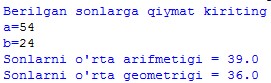 7 topshiriq. Ikkita haqiqiy musbat a va b son berilgan bo’sin. Ularning o’rta arifmetik va o’rta geometrigini topish dasturini tuzing.