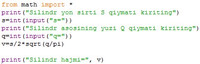 Silindr yon sirti S qiymati kiriting s=9 Silindr asosining yuzi Q qiymati kiriting q=4 Silindr hajmi= 5.077706251929807 |
