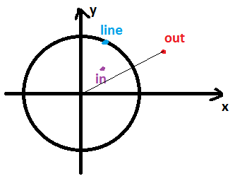 Misol4. Markazi koordinatalar boshida va radiyusi R ga teng bo’lgan aylana berilgan. Tekislikdagi (x,y) nuqta bu aylanaga tegishliligini aniqlang. Agar aylana tashqarisida yotsa "out", chizig’ida yotsa "line", ichida yotsa "in" so’zini chiqaring.