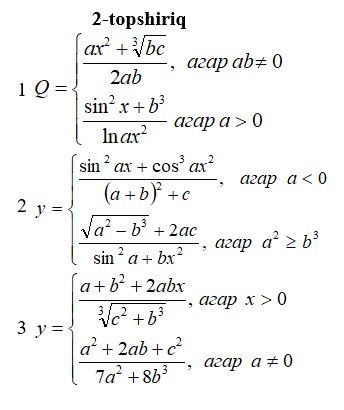 Yechimi: y ning qiymati x ga bog’liq ravishda yoki x2 formula, yoki 2x formula bo’yicha hisoblanadi. Tekshirilishi kerak bo’lgan shart x≥0.
