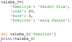 Kalit so’z va qiymatini ochirish uchun del operatoridan foydalanamiz: