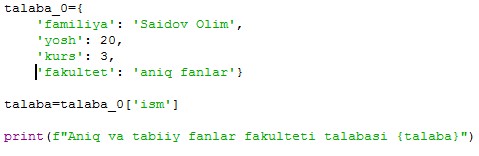 talaba={’familiya’:’Aliyev’,’ismi’:’Salim’}