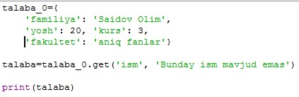 Bunday xatoni kelib chiqmasligi uchun get() metodi yordamida lug'atga murojat qilish va mavjud bolmagan kalitning o'rniga biror xabar qaytarish mumlik.