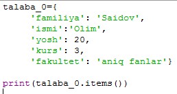 dict_items([('familiya', 'Saidov'), ('ismi', 'Olim'), ('yosh', 20), ('kurs', 3), ('fakultet', 'aniq fanlar')]) |
