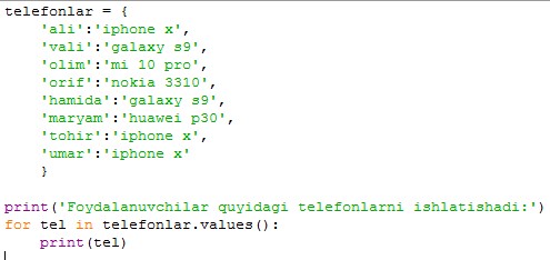 Yuqoridagi usul bilan qiymatlarni chiqarganimizda, lug'atdagi barcha qiymatlar chiqib keladi. Agar, biror qiymat ko'p marta qaytarilsa, konsolga ham ko'p marta chiqib keladi.