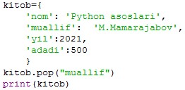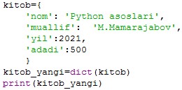{'nom': 'Python asoslari', 'muallif': 'M.Mamarajabov', 'yil': 2021} |