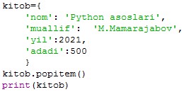 9. popitem() metodi oxirgi kiritilgan kalit-qiymat juftligini olib tashlaydi