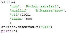 13. setdefault() metodi belgilangan kalit qiymatini qaytaradi. Agar kalit bo'lmasa: kalitni belgilangan qiymat bilan kiriting