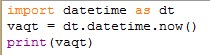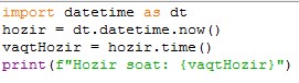 Hozirgi vaqt va sanani koʻrish uchun datetime.now() moduliga murojat qilamiz: