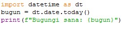 Agar bugungi kunning sanasi talab qilinsa datetime moduli ichidagi date.today() moduliga murojat qilamiz.