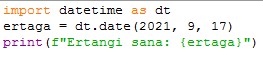 Ushbu modul yordamida Pythonda sanalar bilan ishlashimiz mumkin. Moduldan foydalanishdan avval uni import qilamiz. Har gal moduldan foydalanishda datetime deb qayta yozmaslik uchun, import qilishda modulga dt nomini beramiz.