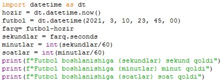 Istalgan vaqtni qoʻlda kiritish uchun esa .time() metodiga kerakli vaqtni (soat, minut, sekund), ikki vaqt oraligʻini sekundlarda yoki soatlarda koʻrinishida beramiz: