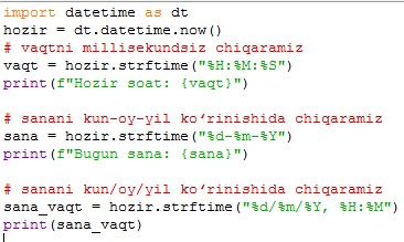 Yuqorida sanalar AQSh standartiga koʻra, yil-oy-kun koʻrinishida chiqayapti. Sanani oʻzimizga moslab chiqarish uchun .strftime() metodini chaqiramiz, va sanani oʻzimizga qulay formatda chiqaramiz.