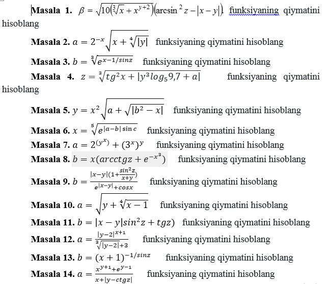 8 topshiriq. Funksiyaning qiymatini hisoblang