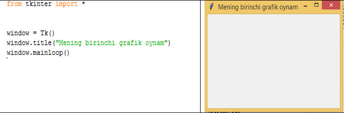 1. Tkinter -ni import qilamiz va unga nom beradigan oyna yaratamiz: