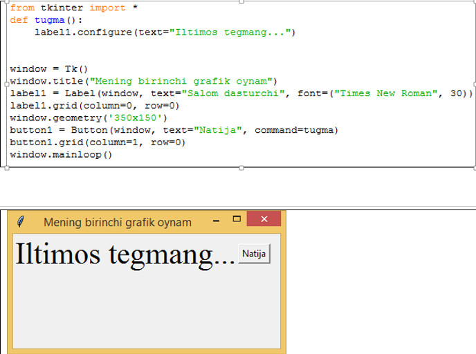 button1 = Button(window, text="Natija", bg="yellow", fg="blue"))