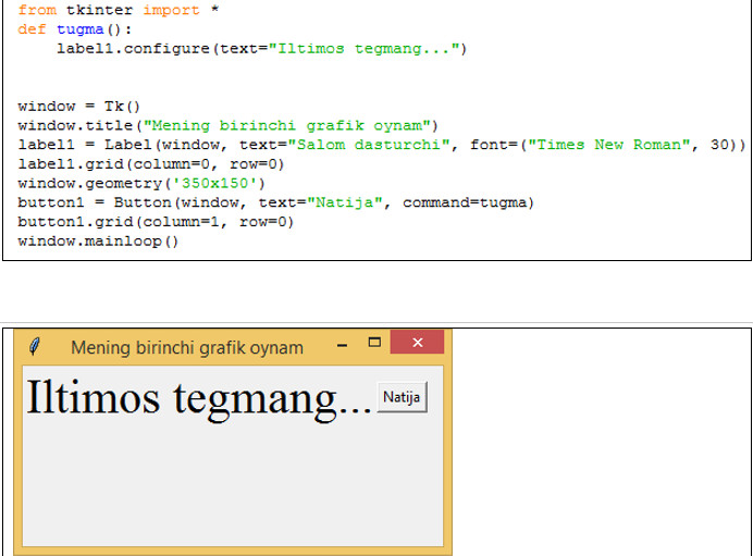 qi shundaki, agar biz 1-usul ko’rinishida Tkinter modulini import qilsak: biz dastur kodini yozayotganimizda har bir tkinter metodi oldidan tkinter so’zini yozishga majburmiz. Ikkinchi usulda esa bunday majburiyatdan halos bo’lamiz va kodimiz qisqa va aniq ko’rinishdan iborat bo’ladi.
