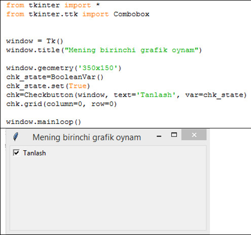 from tkinter.ttk import Checkbutton chk = Checkbutton(window, text='Tanlash')