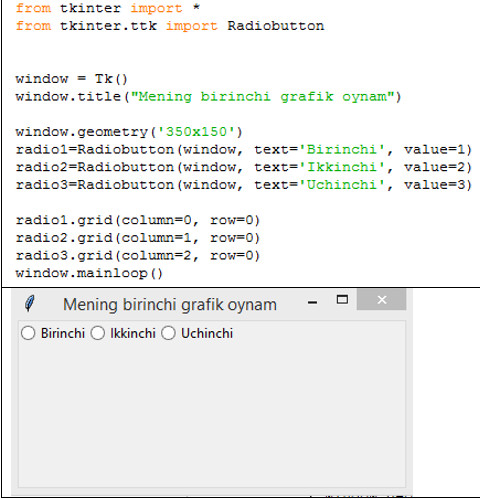 Radiobutton vidjeti bir qator parametrlarni radio tugmalari sifatida ko'rsatish uchun ishlatiladi. Bunda foydalanuvchi bir vaqtning o'zida faqat bitta variantni tanlashi mumkin bo’ladi. |