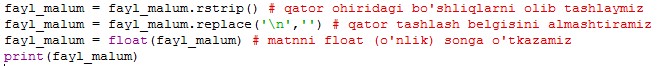 Saqlangan ma'lumot son bo'lsada, fayldan o'qiganimizda qaytgan qiymat matn ko'rinishida bo'ladi. Matnni songa o'tkazish uchun, unga biroz ishlov beramiz: