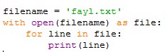 Baʻzida faylni toʻliqligicha emas, qatorma-qator oʻqish talab qilinishi mumkin. Masalan, faylda talabalrning ismi yoki kundalik ob-havo maʻlumotlari saqlangdanda va hokazo. Bunday hollarda for tsiklidan foydalanamiz: