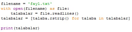 Qatorlarni ro'yxat ko'rinishida saqlab olish uchun, .readlines() metodidan foydalanamiz.