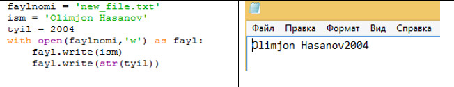 Afsuski, faylga bir nechta ma'lumot yozganimizda, ma'lumotlar alohida qatordan emas, bir qatorda bir-biriga qo'shib qo'shib yoziladi.