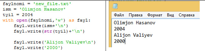 Yangi faylga ma'lumot yozish uchun open() funksiyasini chaqirishda 'w' (write) argumentidan foydalanamiz. Ochilgan faylga ma'lumot qo'shish uchun esa .write() metodini chaqiramiz.