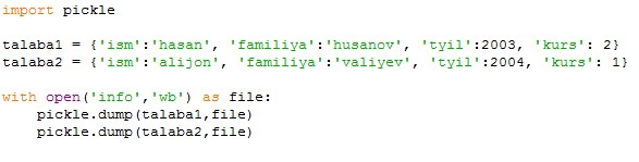 Pickle dan foydalanish uchun biz avval bu modilni import qilamiz. Faylno ochishda esa, open() funksiyasiga ikkinchi argument sifatida 'wb' (write binary) beramiz, ya'ni ikkilik sanoq tizimida yozishni ko'rsatamiz. Faylga yozish uchun esa pickle.dump() metodidan foydalanamiz: