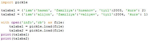 Pickle fayldan o'qish uchun open() funksiyasini 'rb' (read binary) argumenti bilan chaqiramiz. O'zgaruvchilarni bitta faylga yozganimizda, har bir o'zgaruvchi alohida qatordan yoziladi. Fayldan o'qishda ham har bir qatorni alohida o'qishimiz kerak bo'ladi: