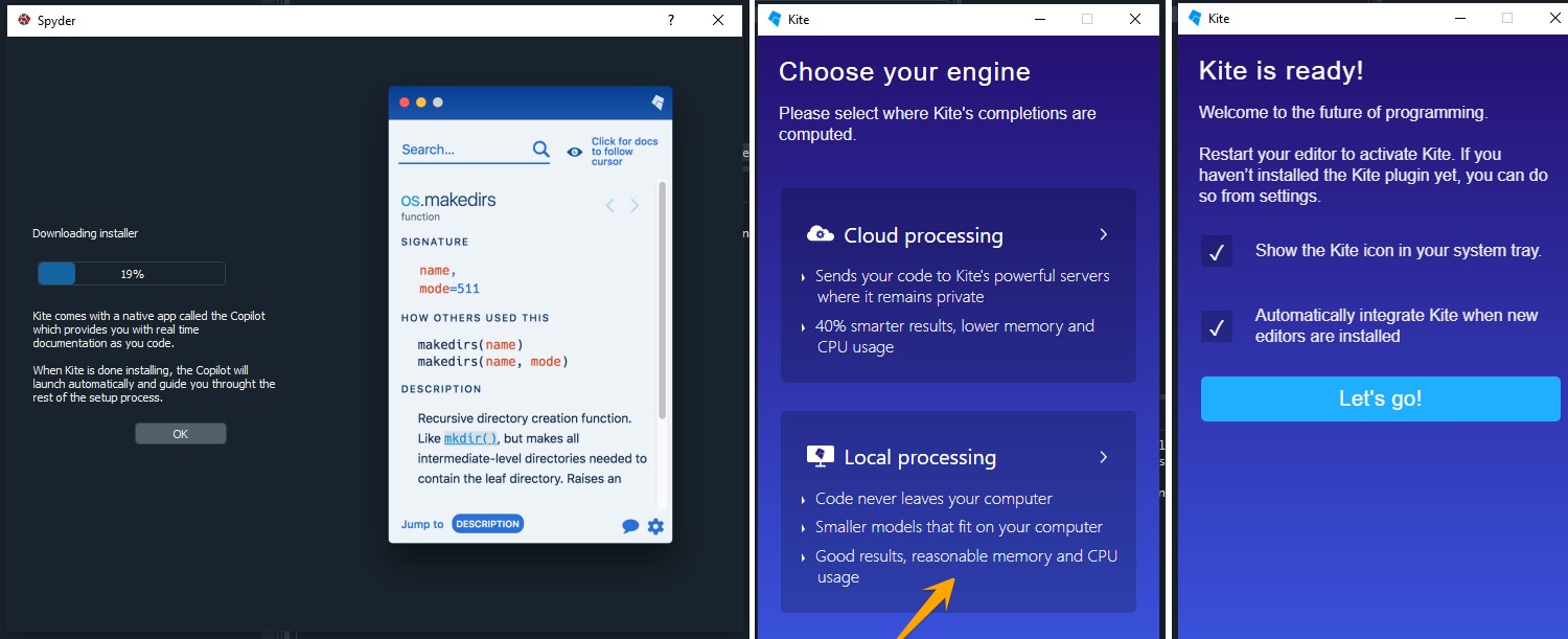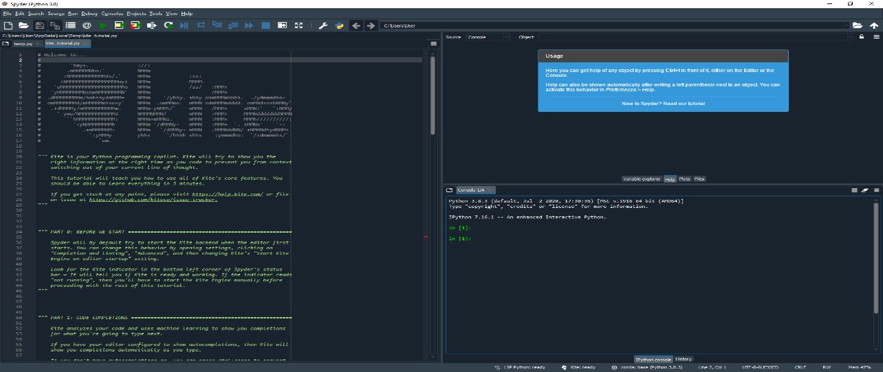 Spyder dastruni ilk marotaba ochganimizda Kite dasturlash yordamchisini (pogramming assistant) o'rnatishni taklif qilishi mumkin.